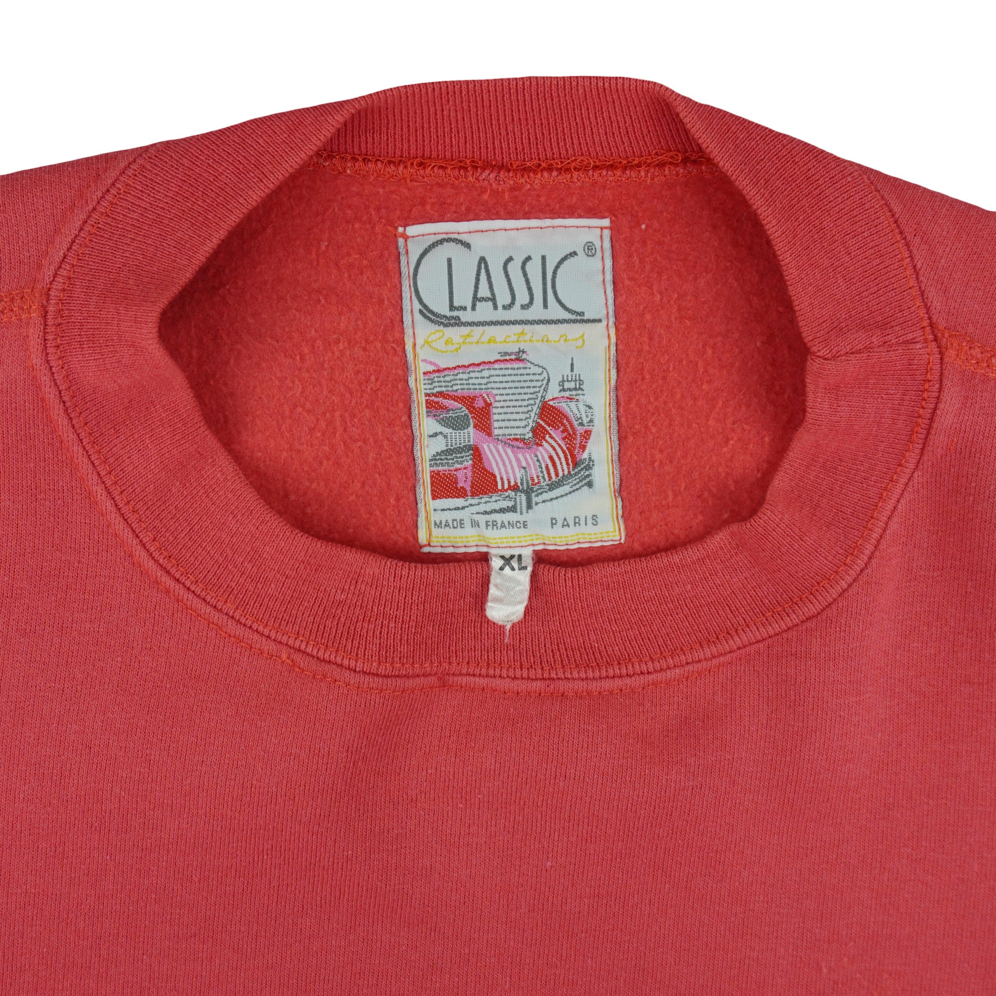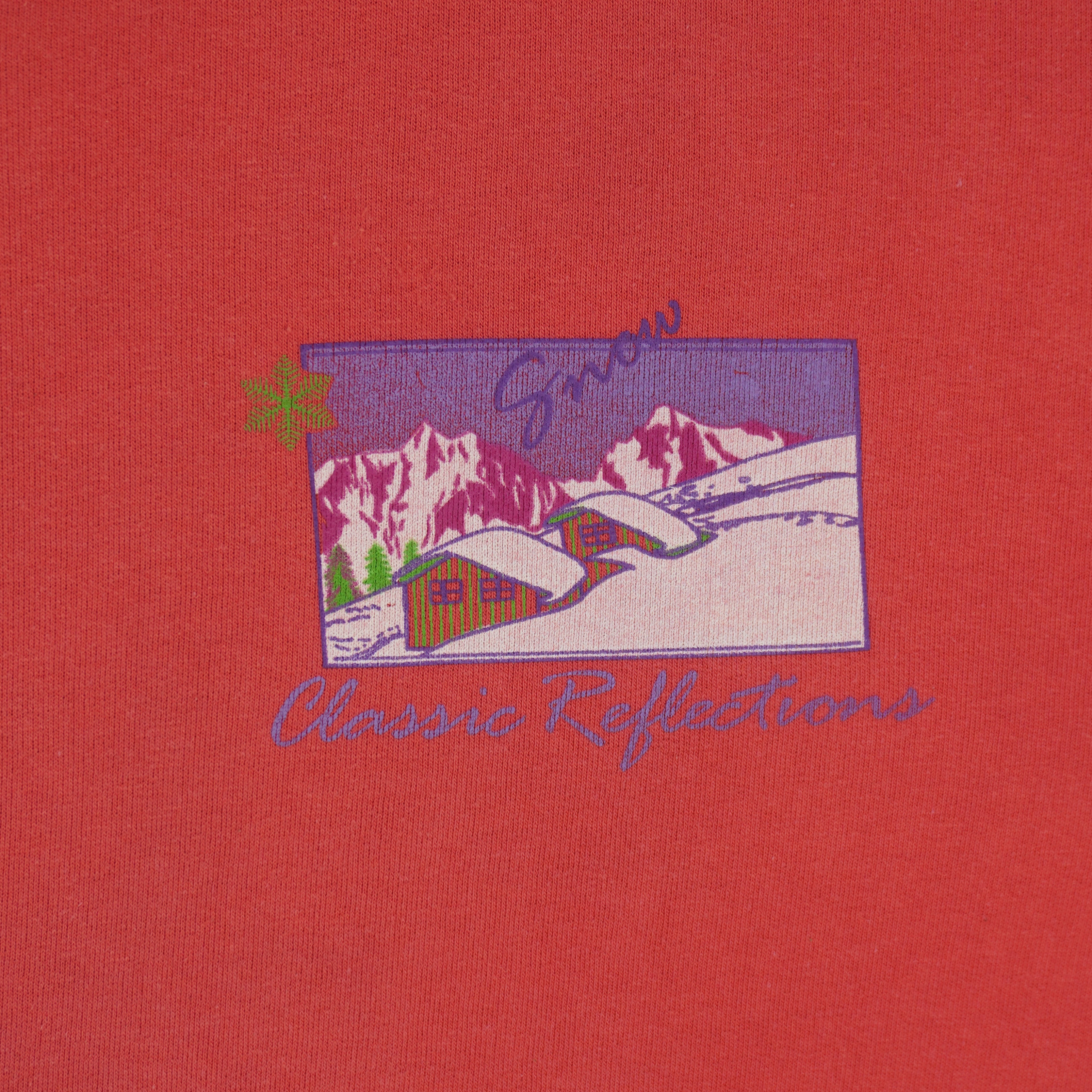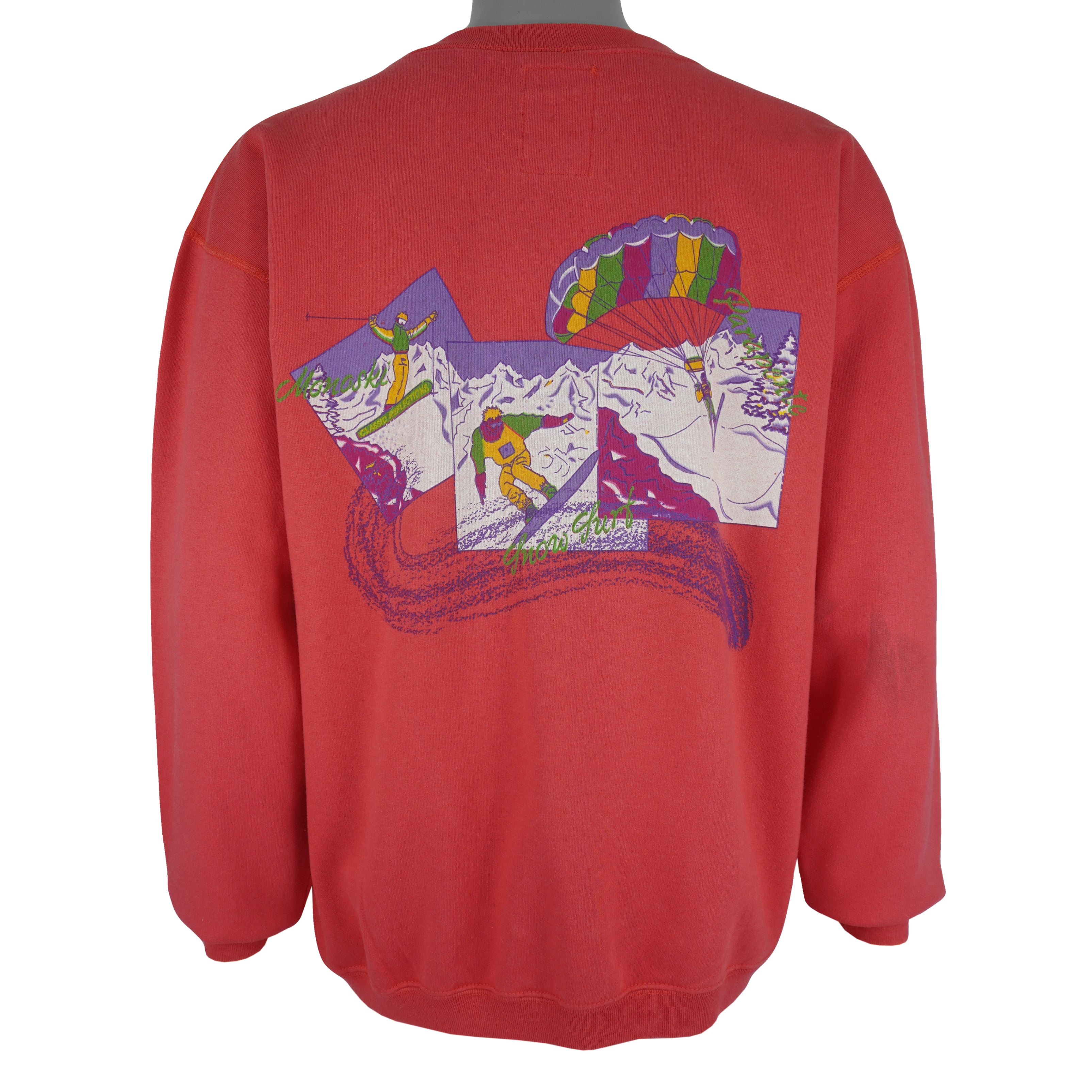1990s Vintage Snow Sports Mountain Crew Neck Sweatshirt by Classic Reflections. Red in color, graphics showcasing three framed winter sports scenes skiing, snowboarding, and parapente spell-out on the back, fitting an X-large size with signs of wear, discoloration on sleeves and is otherwise in very good condition.